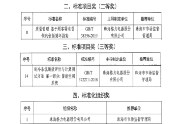 同時(shí),格力主導(dǎo)制定的《GB/T 38356-2019質(zhì)量管理 基于顧客需求引領(lǐng)的創(chuàng)新循環(huán)指南》和《GB/T 37227.1-2018制冷系統(tǒng)績效評(píng)價(jià)與計(jì)算測試方法 第一部分:蓄能空調(diào)系統(tǒng)》分別獲得廣東省標(biāo)準(zhǔn)化突出貢獻(xiàn)獎(jiǎng)標(biāo)準(zhǔn)項(xiàng)目獎(jiǎng)的二等獎(jiǎng)和三等獎(jiǎng),是本次獲得獎(jiǎng)項(xiàng)最多的家電企業(yè)。