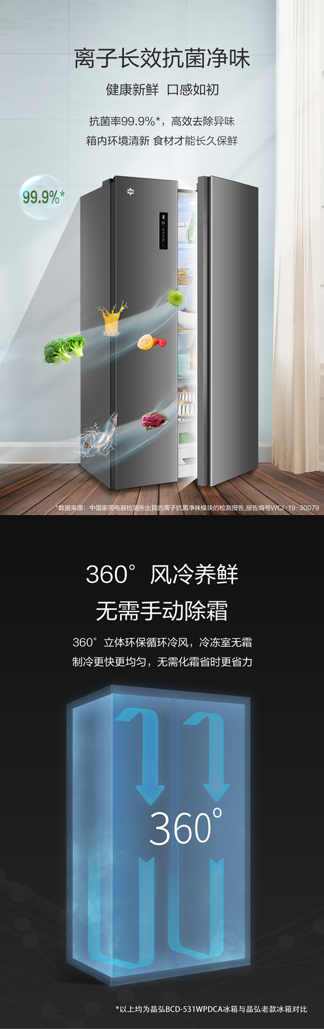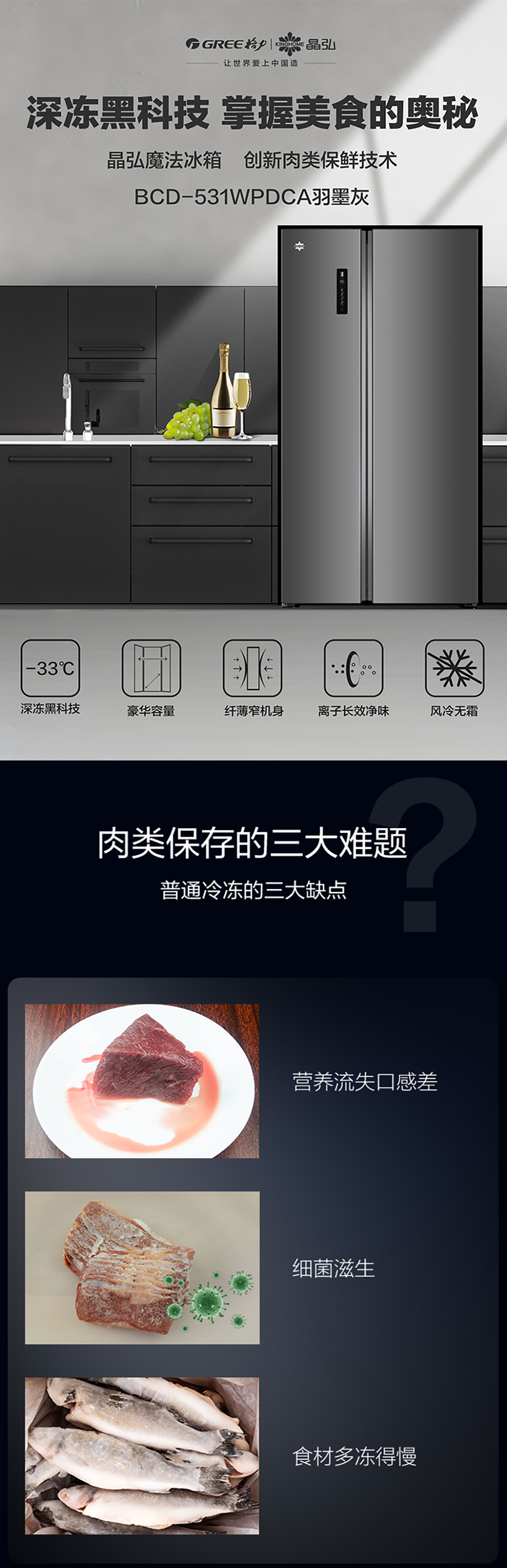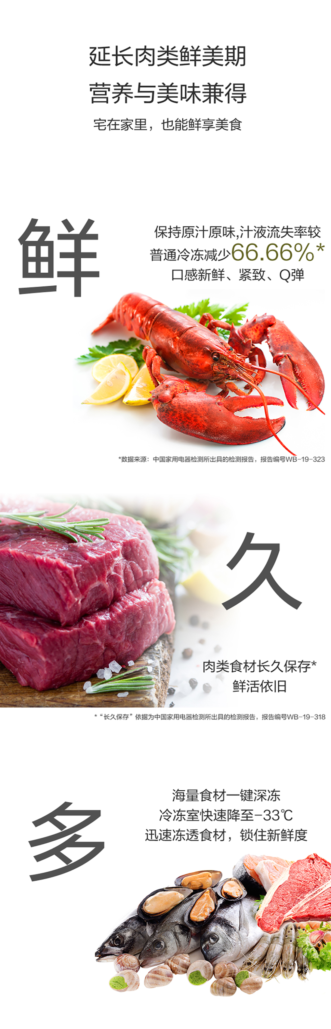 搭載-33℃深凍鎖鮮科技,肉汁飽滿更長(zhǎng)久。采用離子長(zhǎng)效抗菌凈味,抗菌率高達(dá)99.9%。風(fēng)冷無(wú)霜,拒絕風(fēng)干,食材水潤(rùn)新鮮。