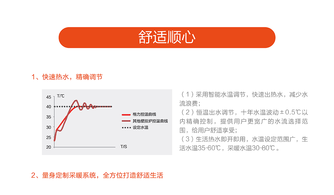 充分燃燒效率達(dá)到90%以上,采用智能水溫調(diào)節(jié),快速出熱水,減少水流浪費(fèi),恒溫±0.5℃以內(nèi)精確控制,生活水溫度35-60℃,采暖水溫30-80℃。